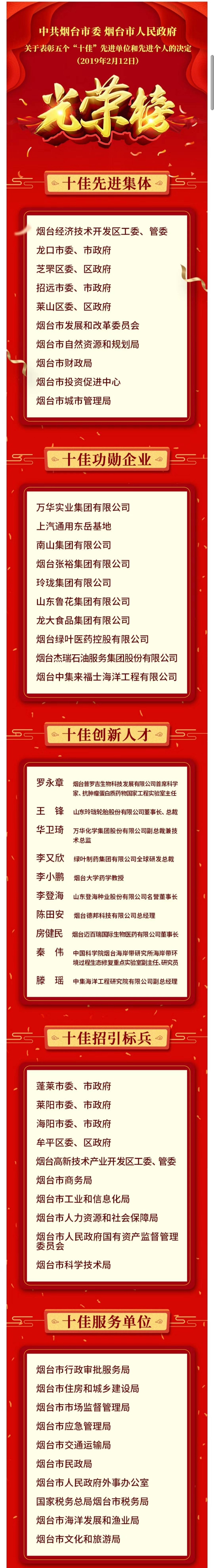 2月12日,2018年烟台高质量发展总结表彰大会召开。会议隆重表彰了烟台市十佳先进集体、十佳功勋企业、十佳创新人才、十佳招引标兵和十佳服务单位。AG恒峰食品集团有限公司荣获“烟台市十佳功勋企业”称号。