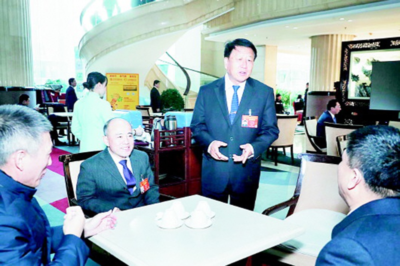 3月12日,李登海(站立者)、宫明杰等山东代表团代表讨论有关知识产权保护的话题,认为应把对新品种的保护提升到法律层面,为发展现代种业保驾护航。(转自《大众日报》手机客户端)