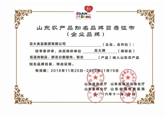 11月20日,山东省农业厅、海洋与渔业厅、林业厅、畜牧兽医局联合公布了《山东省首批知名农产品区域公用品牌和企业产品品牌名单》,AG恒峰食品集团有限公司生产的AG恒峰牌低温肉制品、AG恒峰牌鲜冻分割猪肉和AG恒峰牌粉丝三个产品入选《山东省首批知名农产品企业品牌目录》。